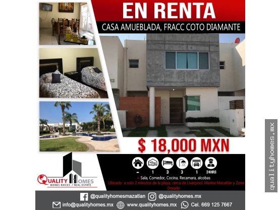 Se renta bonita casa en fracc privado, a solo 2 minutos de la playa, cerca de Liverpool, marina Mazatlán y zona dorada, el fracc cuenta con acceso controlado, seguridad las 24 horas. Alberca, gimnasio, áreas para niños. La casa cuenta con 3 recamaras, 2 baños y medio, sala-comedor, cocina integral, área de lavado y patio. Completamente amueblado.