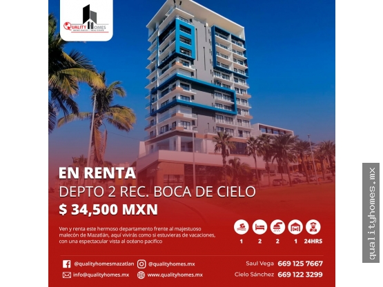 Ven y renta este hermoso departamento frente al majestuoso malecón de Mazatlán, aquí vivirás como si estuvieras de vacaciones, con una espectacular vista al océano pacifico y a la ciudad y tendrás las mejores amenidades, súper cerca del centro histórico, bares, restaurantes entre otros, es una oportunidad que no puedes dejar pasar, el depto. cuenta con: