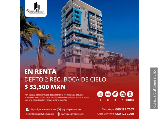 Ven y renta este hermoso departamento frente al majestuoso malecón de Mazatlán, aquí vivirás como si estuvieras de vacaciones, con una espectacular vista al océano pacifico y a la ciudad y tendrás las mejores amenidades, súper cerca del centro histórico, bares, restaurantes entre otros, es una oportunidad que no puedes dejar pasar, el depto. cuenta con: