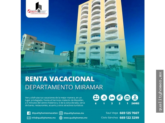 Ven y disfrutas tus vacaciones de la mejor manera, en un lugar privilegiado, frente al hermoso malecón de Mazatlán, a 5 minutos del centro histórico y 3 de la zona dorada, cerca de bares, restaurantes, acuario y otros atractivos turísticos. Ten la privacidad que tú y tu familia necesitan. El depto. Cuenta con: